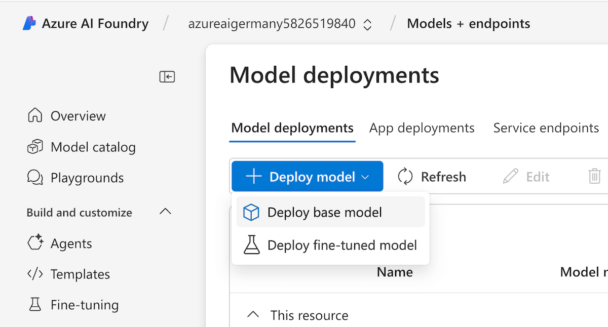 - Deploy base model – standard model from the AI catalog, e.g. gpt-4.1 without further fine-tuning