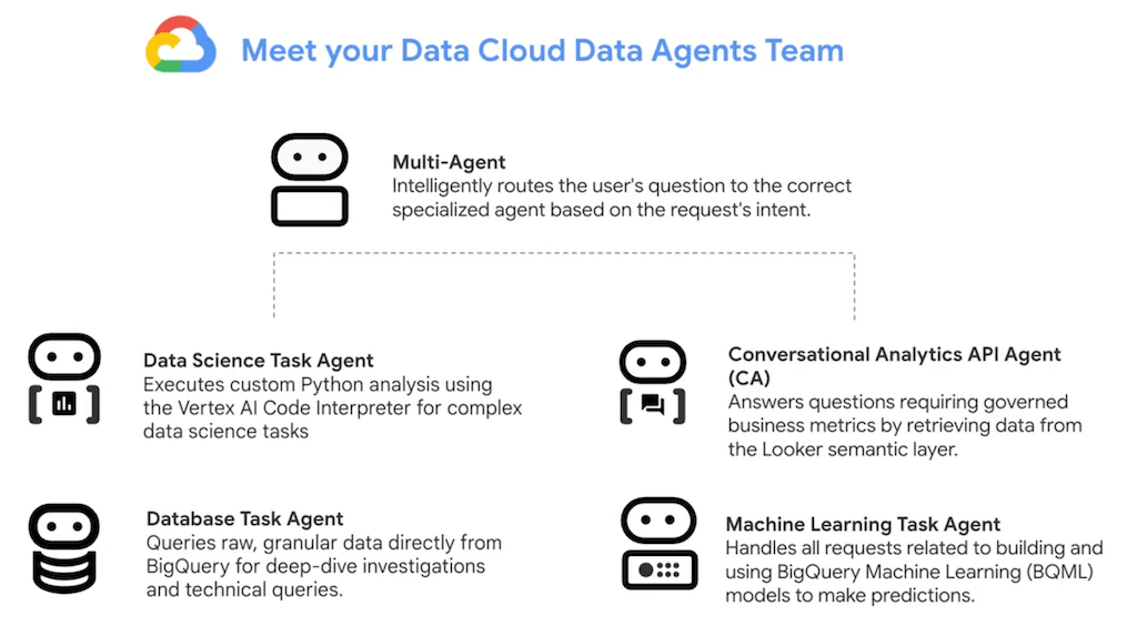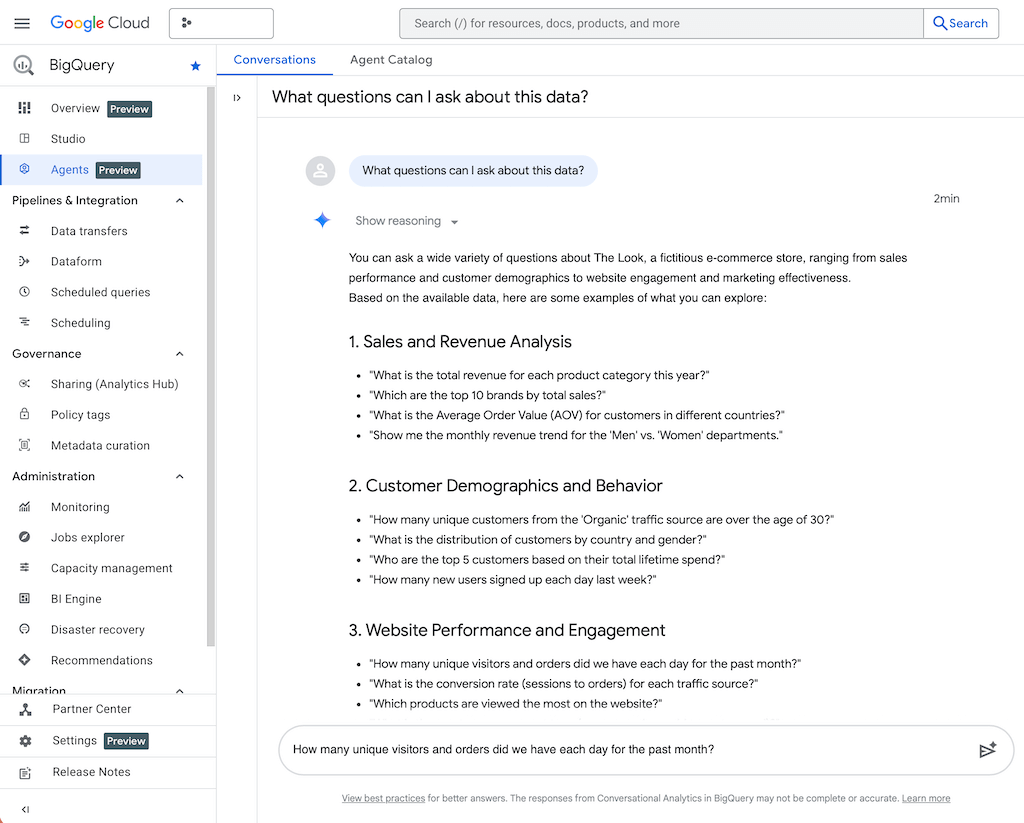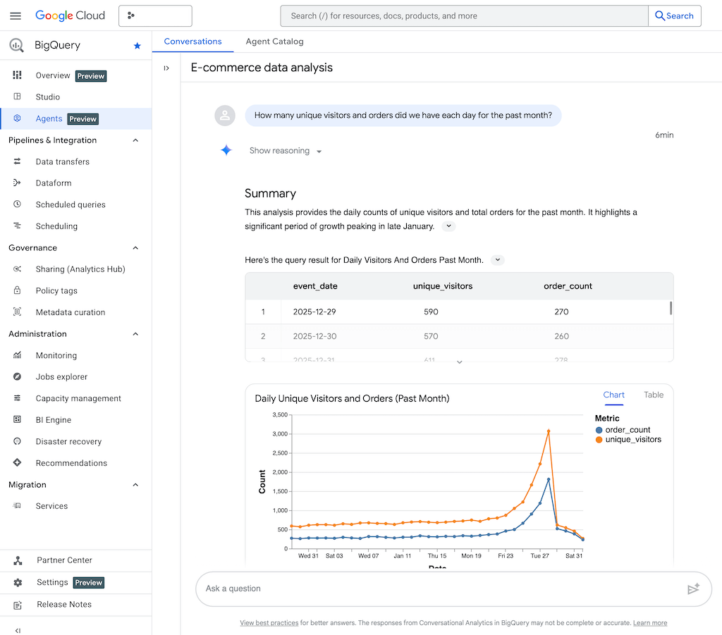 - Conversational Analytics: AI agents for natural data queries can be used directly in BigQuery