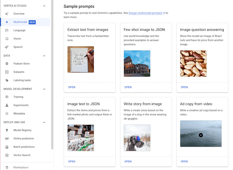 - Click on a desired sample prompt under “Multimodal” to try out the example.