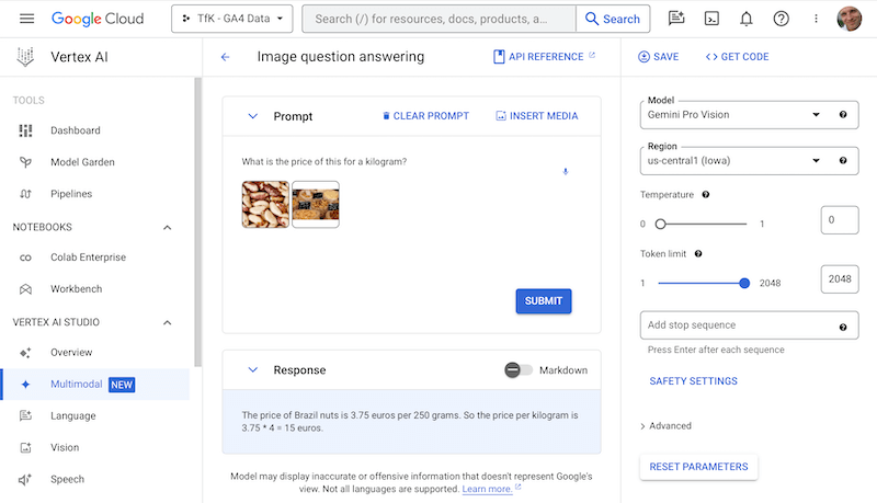 Practical: Google provides code for integrating the model directly with a click in the Studio in many languages including Python or Java (“Get Code”, top right). If you want to test this quickly, you can create an Enterprise Colab in the GCP (i.e. a Jupyter Notebook in the Google Cloud) and integrate and execute the code there directly. Simply click on “Open in Notebook”.