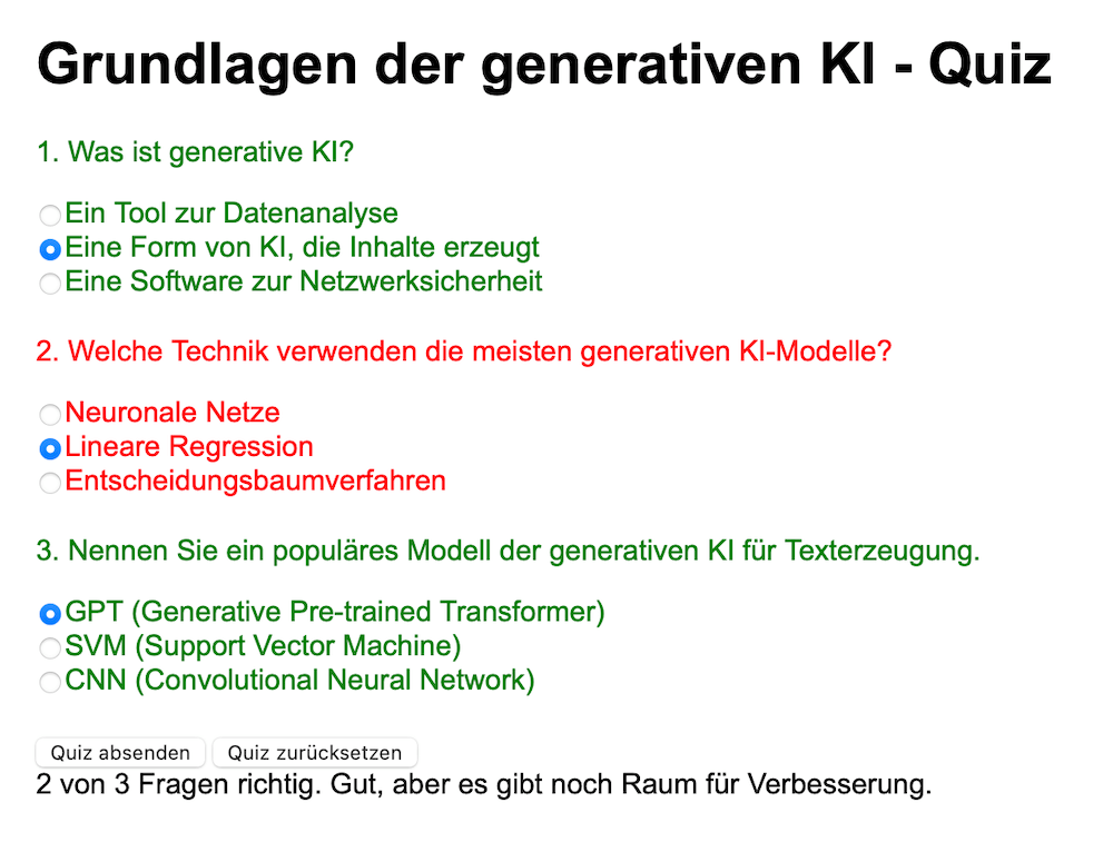 Tip: Test the quiz: ChatGPT delivers the finished HTML, CSS and Javascript. Sometimes mistakes happen, so we test the result before we continue. To do this, copy the code, create an empty file “quiz.html” e.g. in a text editor such as Sublime Text, your favorite IDE, or Notepad and paste the code there for testing. Then open the file in the browser (e.g. via drag & drop). Our test was logically successful, only styles could be improved. You can brief ChatGPT individually, e.g. “make the buttons big and blue” etc.