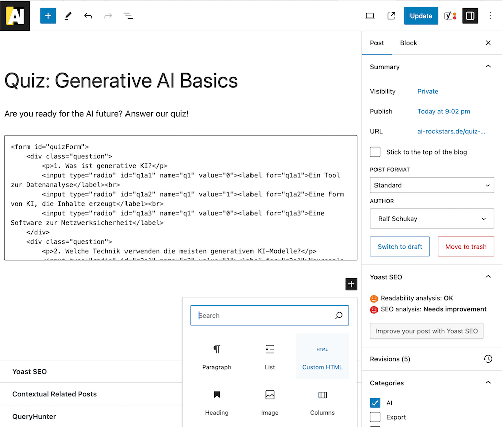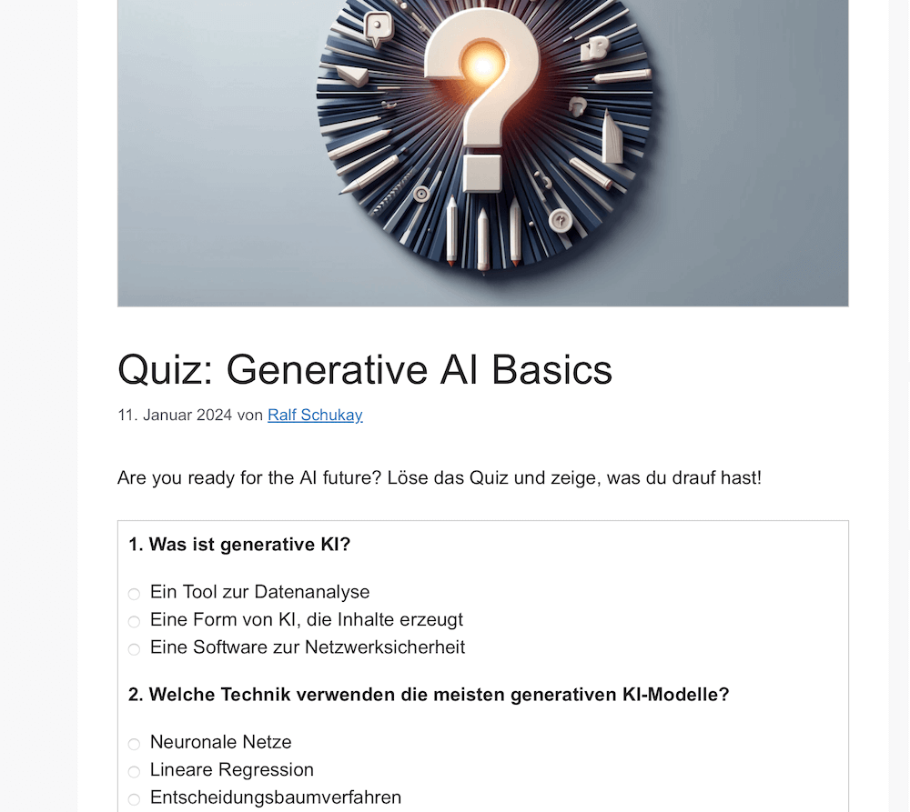 Until now, you had to find suitable tools or hire a developer for such complex content. With generative AI tools such as ChatGPT, you can easily create a quiz yourself for free or at least prepare it quickly without programming knowledge or buying a quiz tool. So, let’s get started and create a quiz for a WordPress blog or website with the help of AI. Your users will thank you for it!