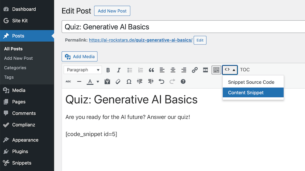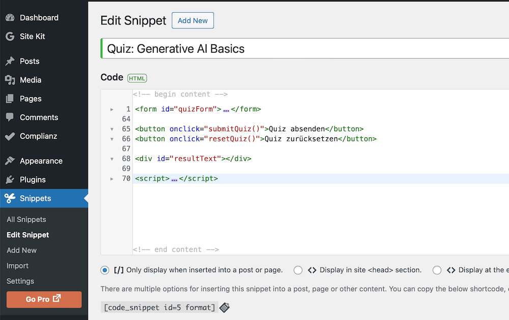 Alternatively, you can install and use a code snippet plugin for WordPress. The free basic version of the“Code Snippets” plugin allows you to create your own code snippets and content blocks and integrate them into WordPress articles or HTML headers. The separation of code and content makes it easier to maintain an overview.