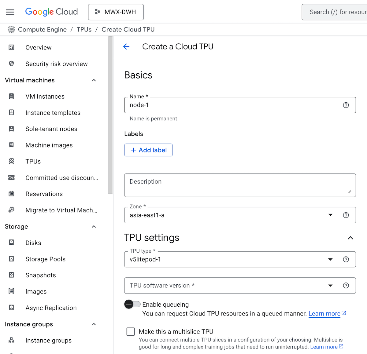 - Go to Compute Engine > TPU and create a new TPU engine: https://console.cloud.google.com/compute/tpus/
