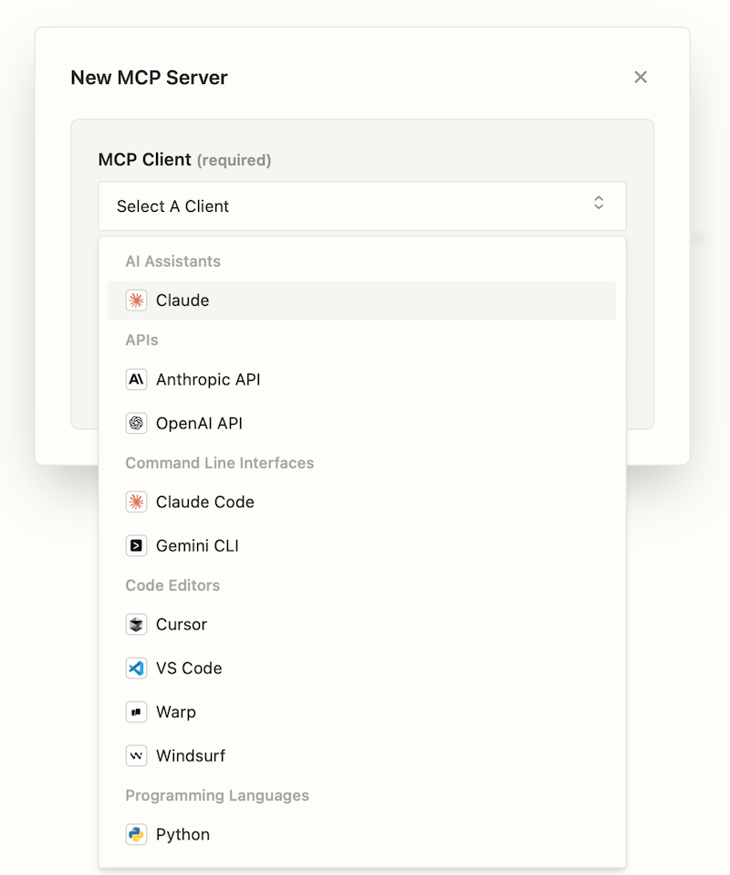 - In the dialog box that appears, select your client from the MCP Client dropdown, for example “Claude”, and enter a name for your server in the Name field.